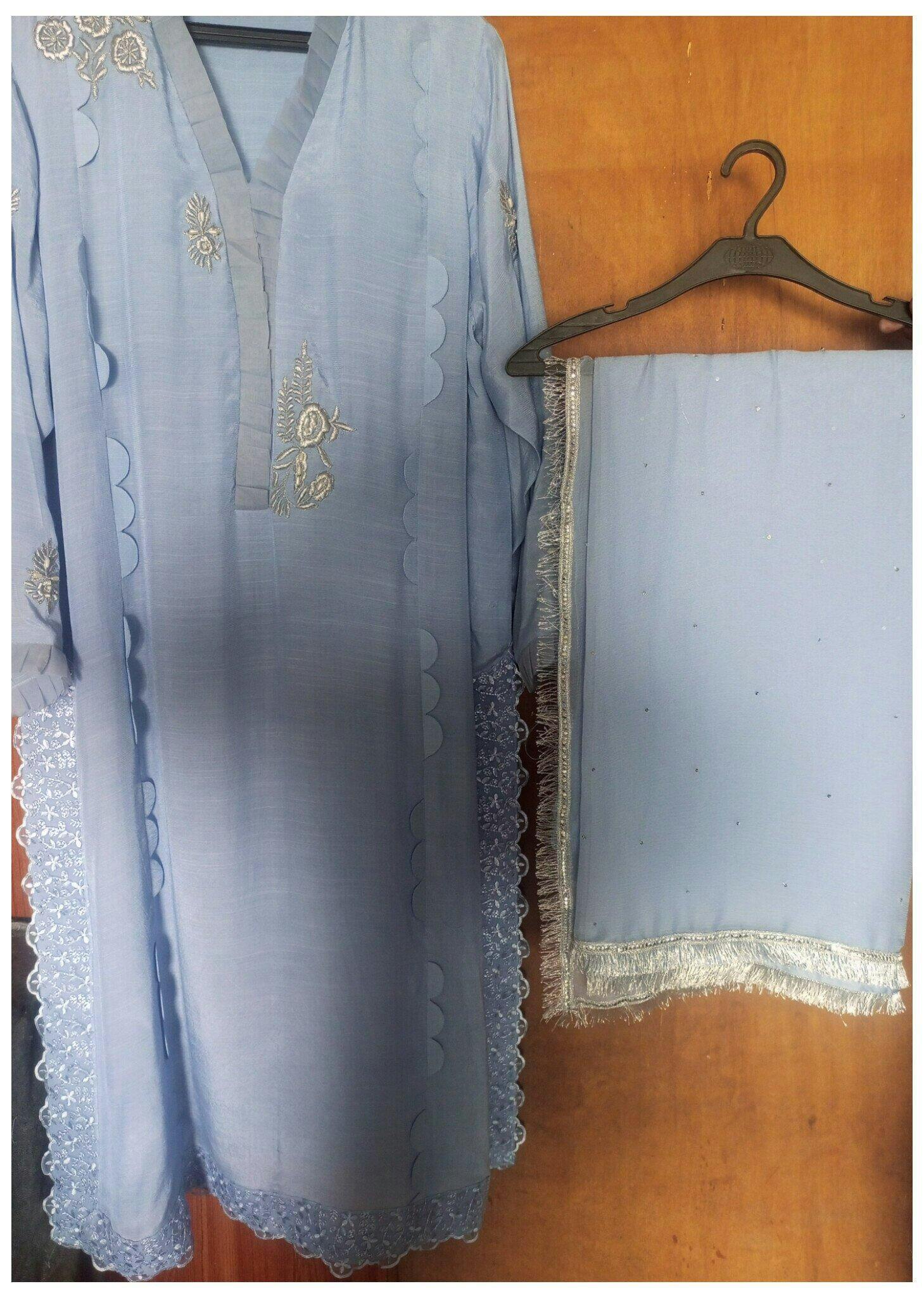 The perfect for spring festivities, boasting a stunning color also elegant raw silk long shirt features a beautiful neckline adorned with beautiful embroideries. Paired with raw silk long pants and embellished dupatta, this look exudes elegance and sophistication, ideal for any special occasion.